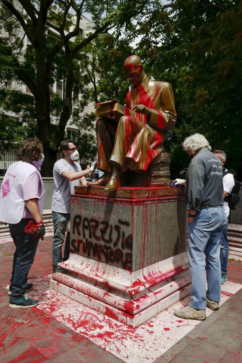 Indro Montanelli, volontari ripuliscono la statua imbrattata con vernice rossa