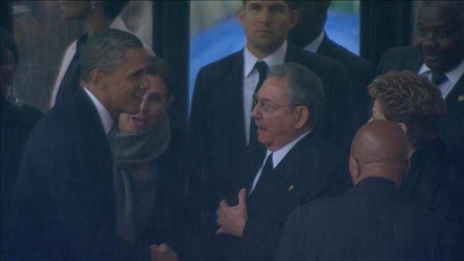 Obama stringe la mano a Raul Castro durante la commemorazione di Mandela