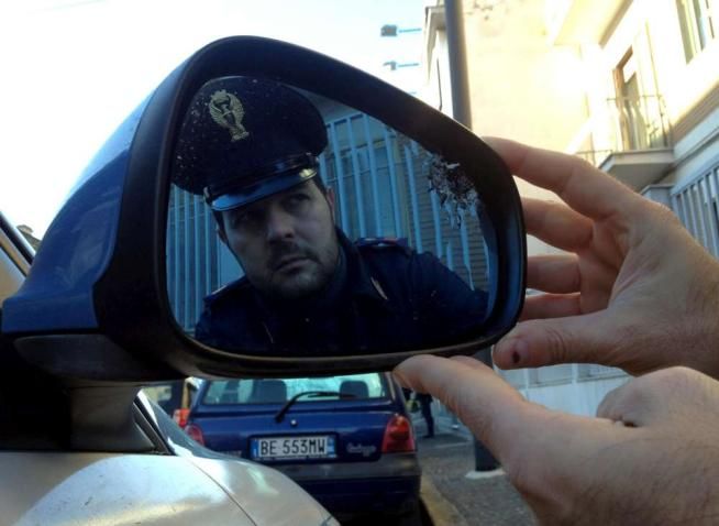 © ansa|Napoli, un agente mostra lo specchietto retrovisore dell'auto della polizia colpita da un proiettile