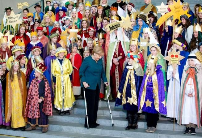Merkel non si ferma, prima uscita pubblica in stampelle dopo l'incidente sugli sci