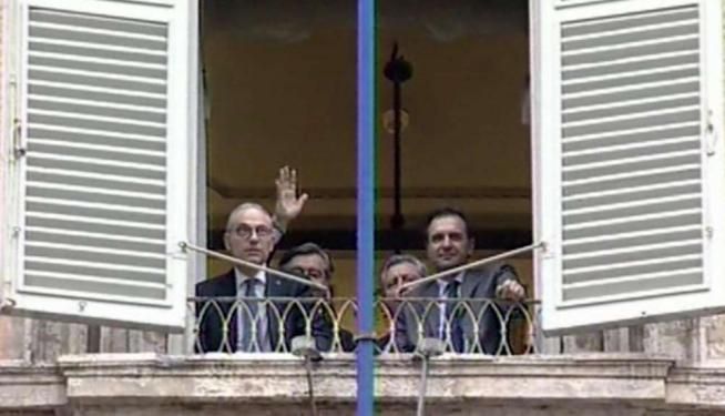 © ansa|Il capogruppo al Senato della Lega Nord, Massimo Bitonci, i suoi due vicepresidenti, Sergio Divina e Raffaele Volpi, e il senatore del Carroccio Jonny Crosio, si affacciano alla finestra dell'ufficio di Grasso