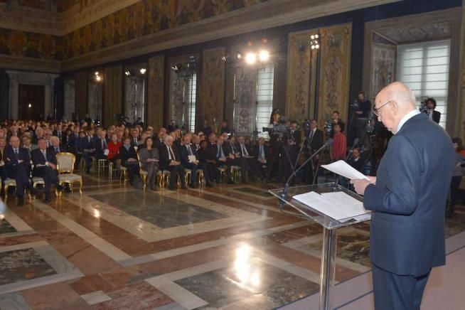 © ansa|Il presidente della Repubblica, Giorgio Napolitano, alla premiazione delle scuole vincitrici della XII edizione del concorso "I giovani ricordano la Shoah"