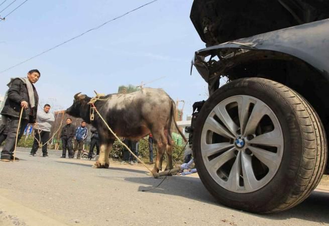 Cina, ha un incidente e sfascia l'automobileLa riporta trainata da un bufalo a noleggio