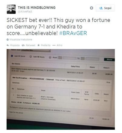 Germania-Brasile, scommette sul 7-1 con gol di Khedira e vince oltre 35 mila euro