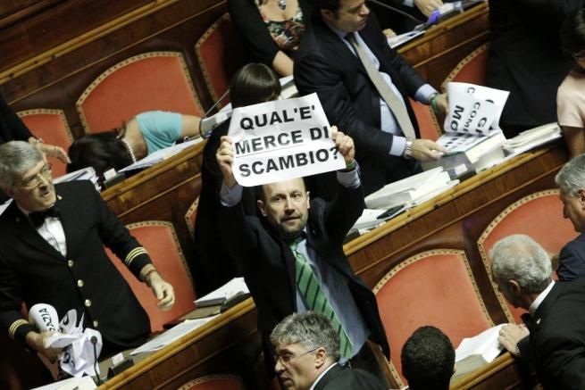 Durante la bagarre nell'Aula del Senato la Lega scivola su un apostrofo