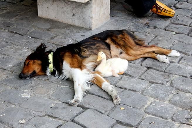Un cane e una papera,strana coppia a Parigi Bizzarro duo scovato e fotografato via social