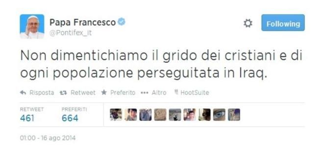 Appello di Papa Francesco su Twitter: "Non dimentichiamo il grido dei perseguitati"