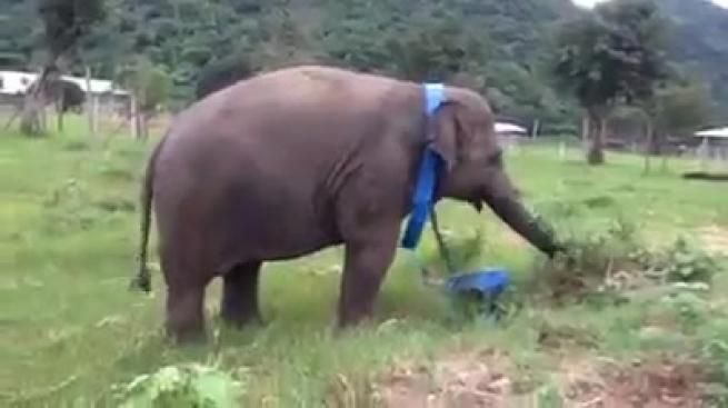 Thailandia, il passatempo del baby elefante: con la proboscide fa volteggiare nastro blu