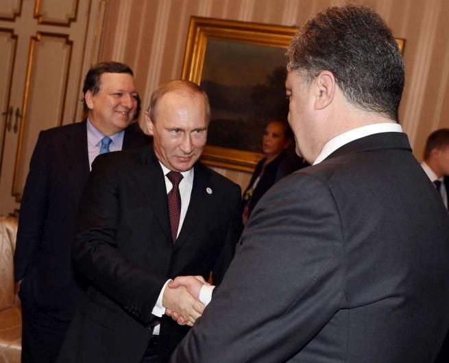 © ansa|Stretta di mano tra il presidente russo Vladimir Putin e quello ucraino Petro Poroshenko