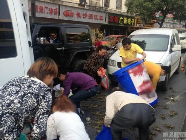 Cina, nemmeno il coccodrillo ferma il saccheggio di granchi caduti da un camion