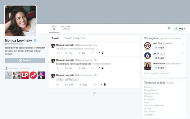 Monica Lewinsky sbarca su Twitter, in meno di un giorno oltre 47mila follower