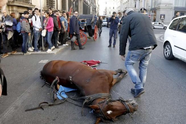 Botticelle, cavallo stramazza in piazza a Roma: è subito polemica