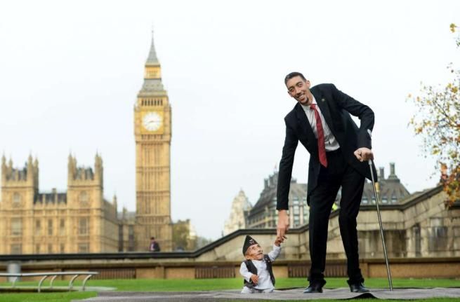 Londra, l'uomo più alto e l'uomo più basso del mondo posano ai piedi del Big Ben