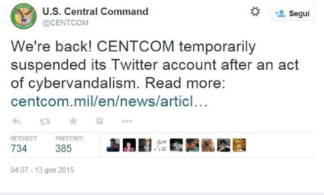 Twitter, l'account del comando militare americano: "Siamo tornati"
