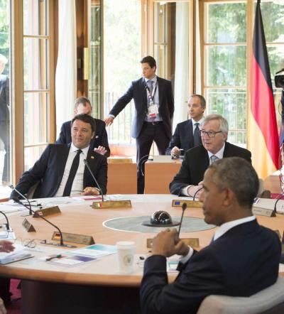 © ansa|Renzi, Juncker e Obama durante i lavori del G7