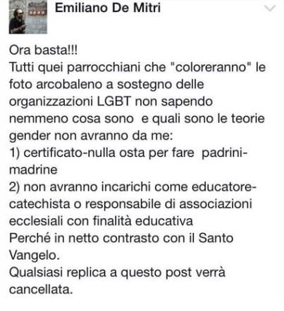 Facebook, un sacerdote contro i gender "Chi li sostiene non potrà fare il padrino"