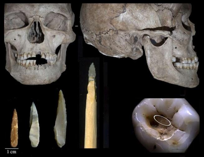 © ufficio-stampa|In alto: vista frontale e laterale del cranio di Villabruna. In basso: punte litiche epigravettiane (a sinistra) utilizzate per produrre le strie identificate all'interno della cavità cariosa del terzo molare inferiore destro (a destra) (foto di M. Romandini)