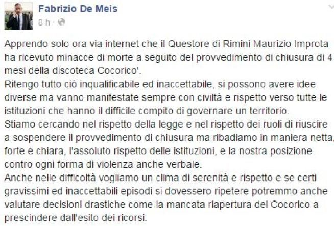 Minacce al questore, il titolare del Cocoricò su Facebook: "Potremmo non riaprire"