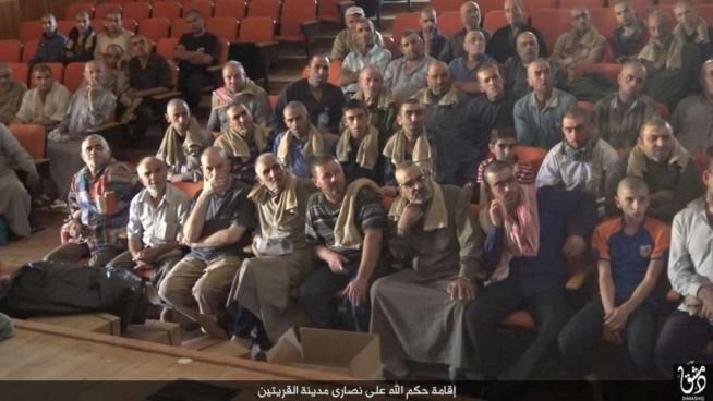 © ansa|Padre Jacques Murad, sulla sinistra in prima fila in maglietta scura e una mano sul collo, durante la lettura di un "contratto" imposto dallo Stato islamico ai cristiani di Qaryatain