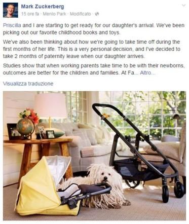 Zuckerberg su Facebook annuncia: "Due mesi di paternità quando nascerà mia figlia"