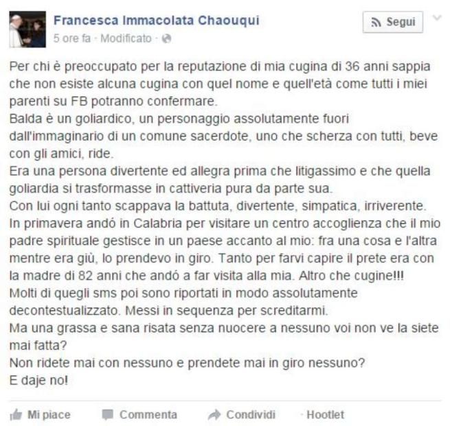 © facebook|Su Facebook il post in cui la Chaouqui si difende dopo la diffusione dei messaggi hot con il monsignore Balda