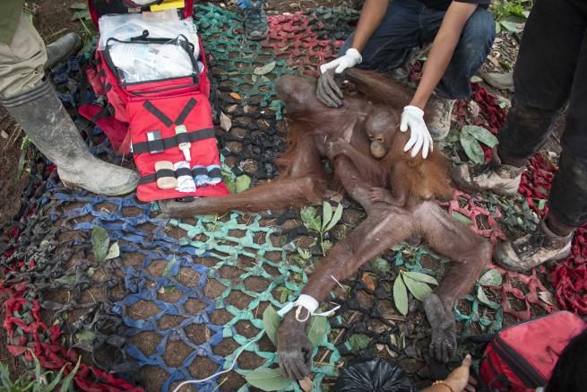 Borneo, affamatissima ma agguerrita: ecco mamma orango che difende il suo cucciolo