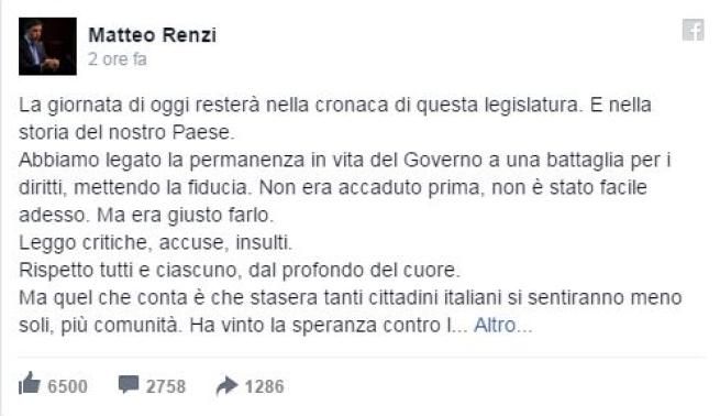Il Senato approva le unioni civili Verdini vota sì, FI: Renzi salga al Colle