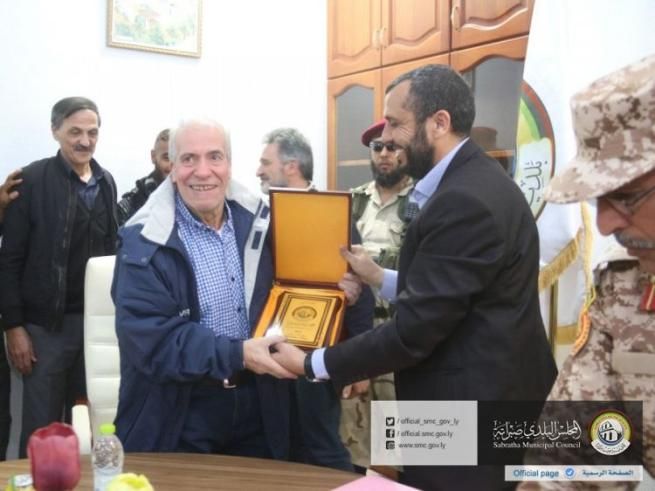 © web|Le foto distribuite online dal Consiglio Municipale di Sabrata in cui si vedono Gino Pollicardo e Filippo Calcagno poco prima della partenza dalla Libia. I due ex ostaggi sono ritratti tra le autorità militari della città libica e mentre ricevono una targa dal sindaco Hussein al-Zawadi.