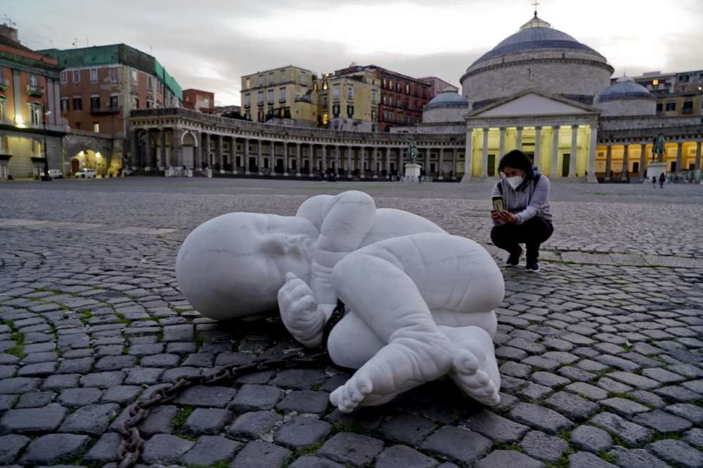 Covid, in piazza Plebiscito a Napoli un bimbo in marmo incatenato a terra: ecco la scultura "Look-down" di Jago