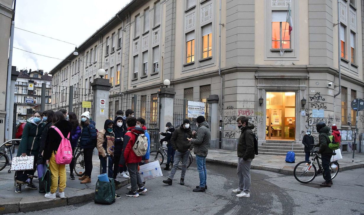 © Ansa|Gli studenti della scuola media Calvino e del liceo Gioberti protestano contro la didattica a distanza seguendo le lezioni davanti agli ingressi degli istituti a Torino (11 novembre 2020)