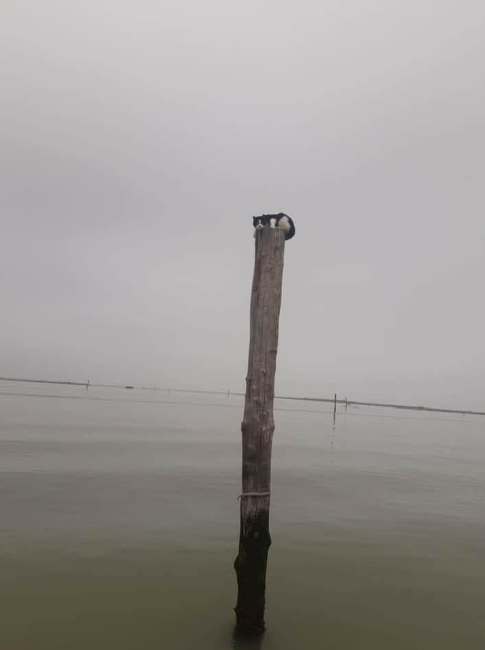 Rovigo, gatto abbandonato su un palo alto 4 metri in laguna