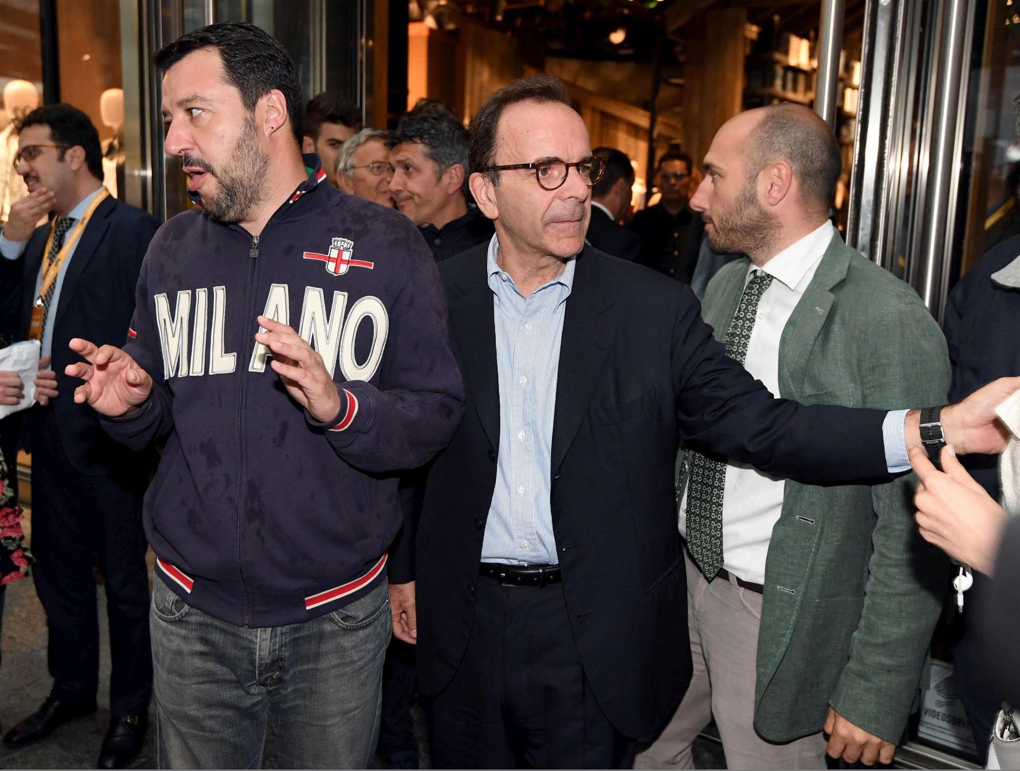 © ansa|Il candidato sindaco di Milano, Stefano Parisi, (centrodestra) con il segretario federale della Lega Nord, Matteo Salvini
