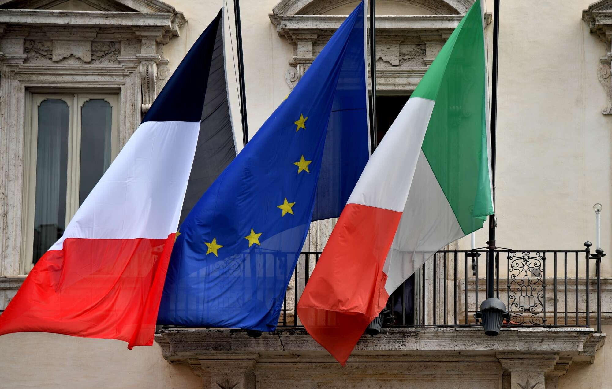 © -afp|Le bandiere di Francia, Italia ed Europa a mezz'asta a Palazzo Chigi dopo gli attacchi a Nizza.