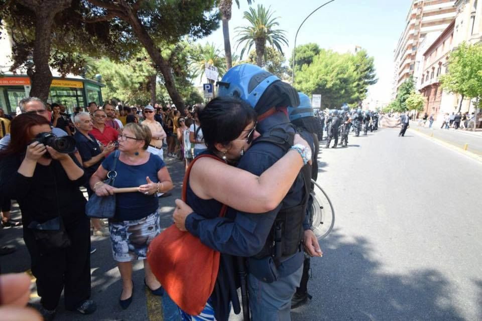 Taranto, l'abbraccio tra il poliziotto che ha vinto il cancro e la mamma anti Ilva