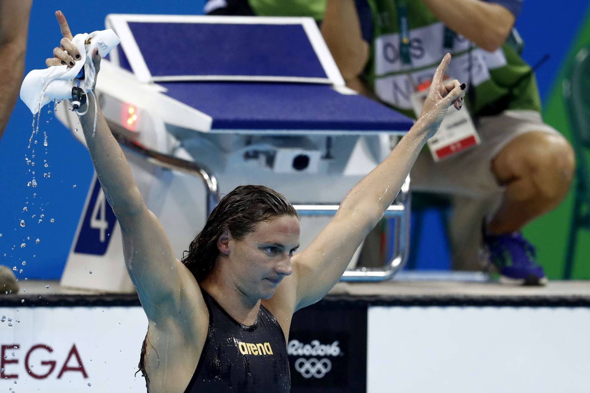 © -afp|Katie Ledecky festeggia il primato nei 400 stile (3'56"46). A Rio la statunitense ha vinto quattro ori e un argento, stabilendo due record del mondo