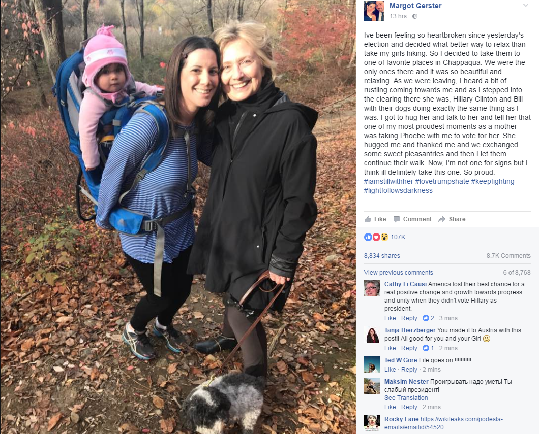 Hillary, passeggiata nei boschi dopo la sconfitta