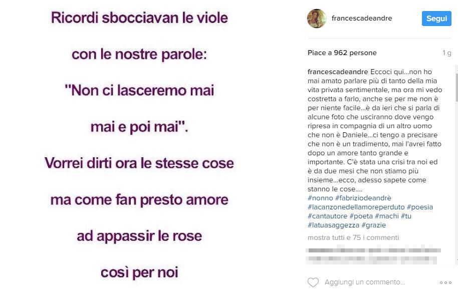 Francesca De André-Daniele Interrante, fine di un amore