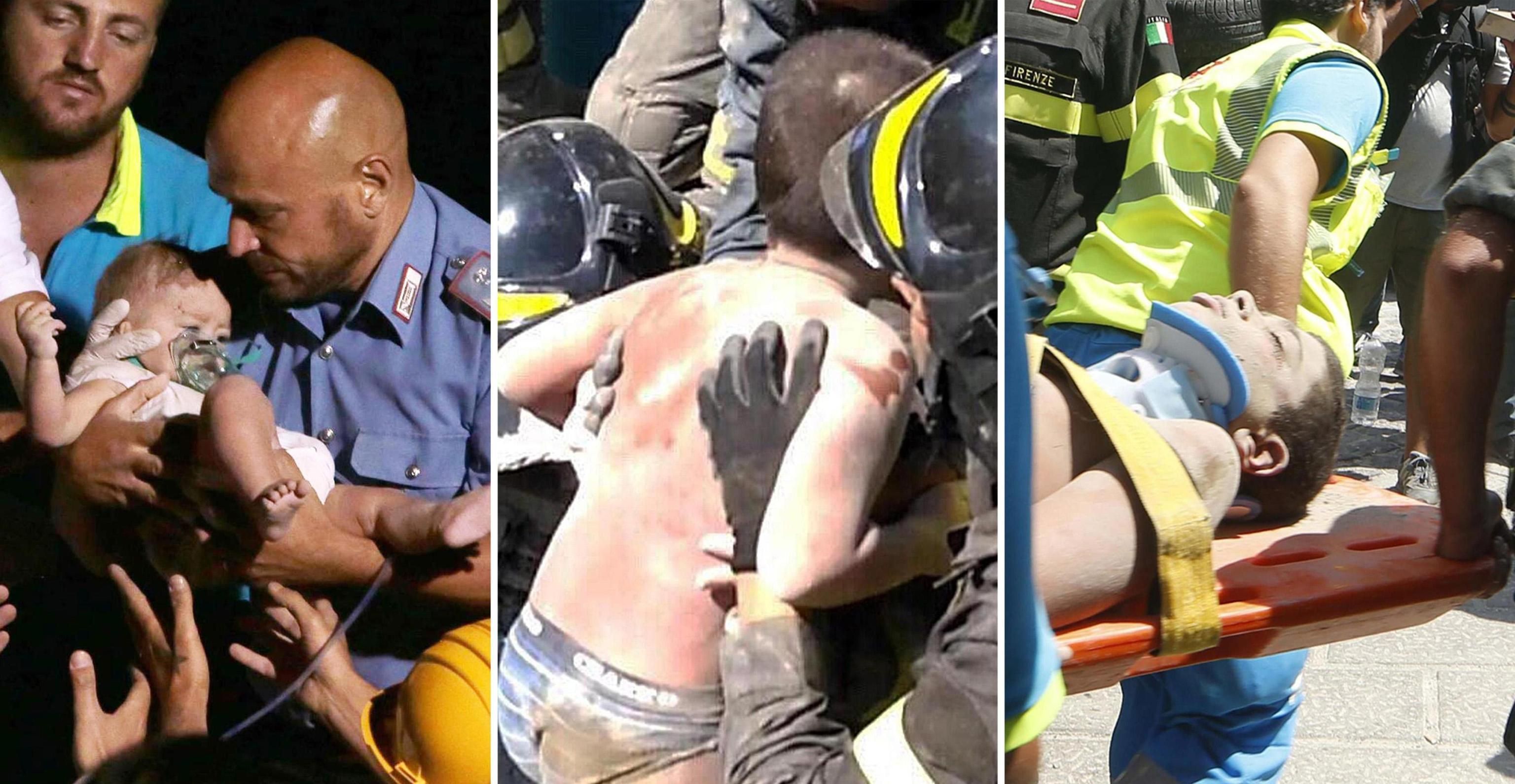 © -afp|Il momento del salvataggio di Pasquale, sette mesi, il primo dei tre fratellini ad essere estratto dalle macerie