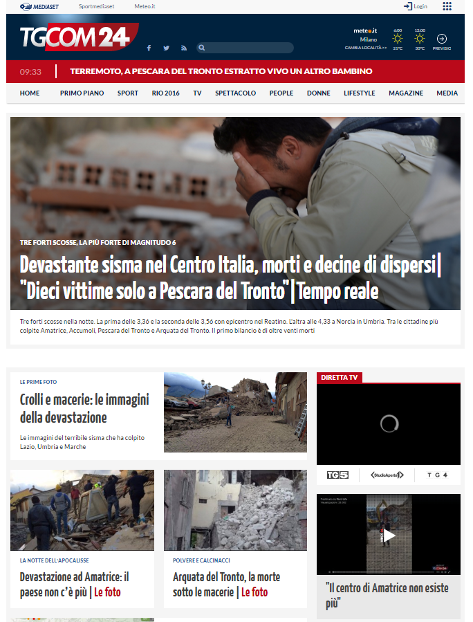 Sisma in Centro Italia, il racconto della tragedia sulla homepage di Tgcom24