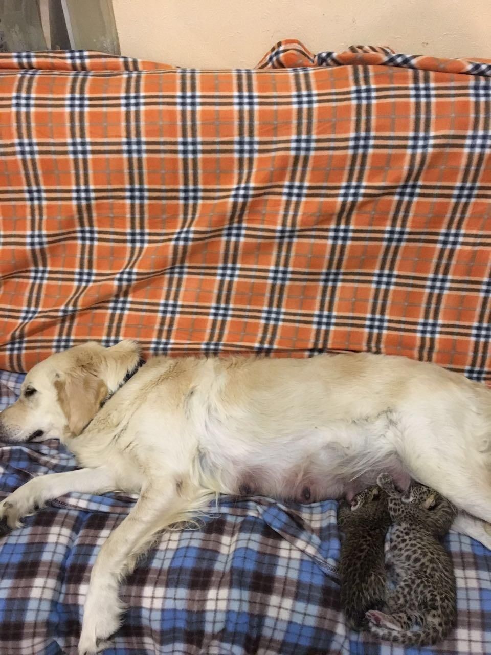 Russia, il cane Tessi adotta due cuccioli di leopardo rifiutati dalla madre