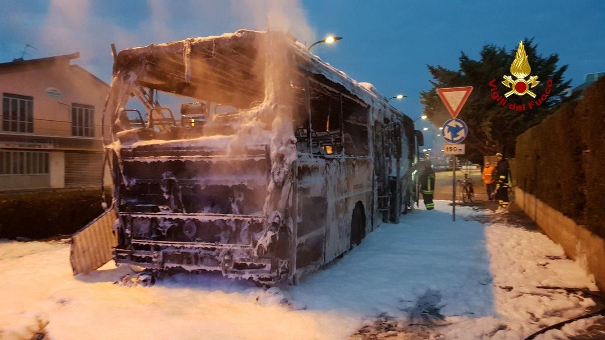 Il bus in fiamme a Sottomarina di Chioggia, l'intervento dei vigili del fuoco