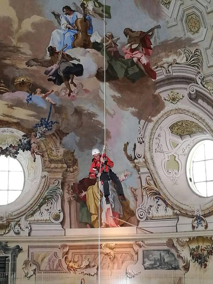 Cuneo, il soccorso alpino in azione tra stucchi e affreschi del Santuario di Vicoforte