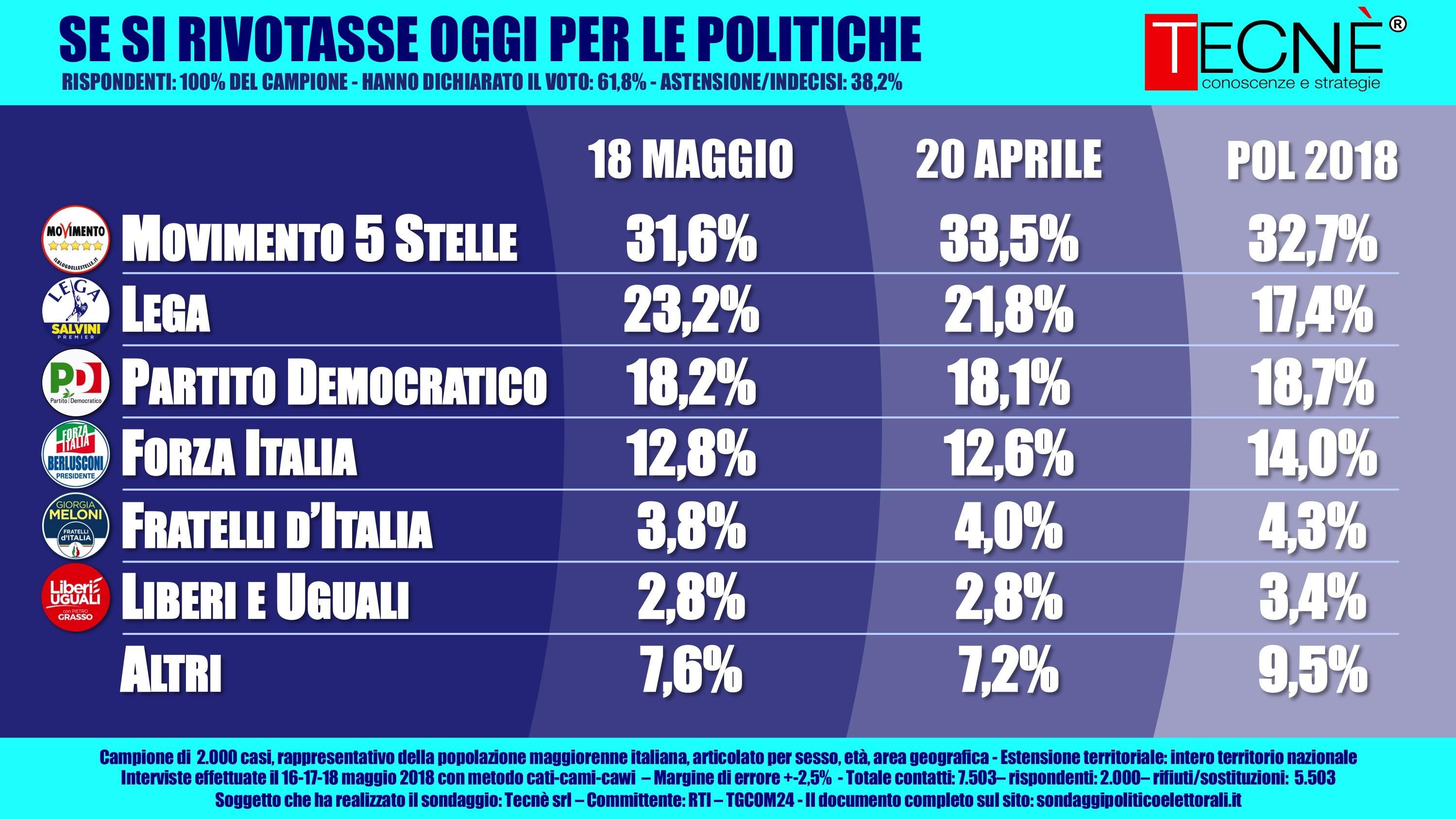 Ultimo sondaggio Tecnè sulle politiche:se si rivotasse, Lega ancora in crescita