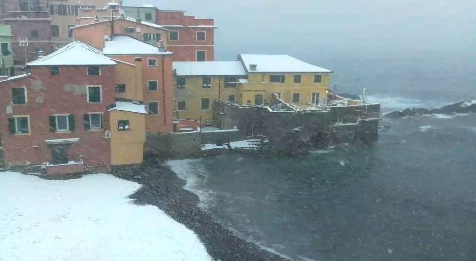 Neve da Nord a Sud: imbiancata la spiaggia a Boccadasse