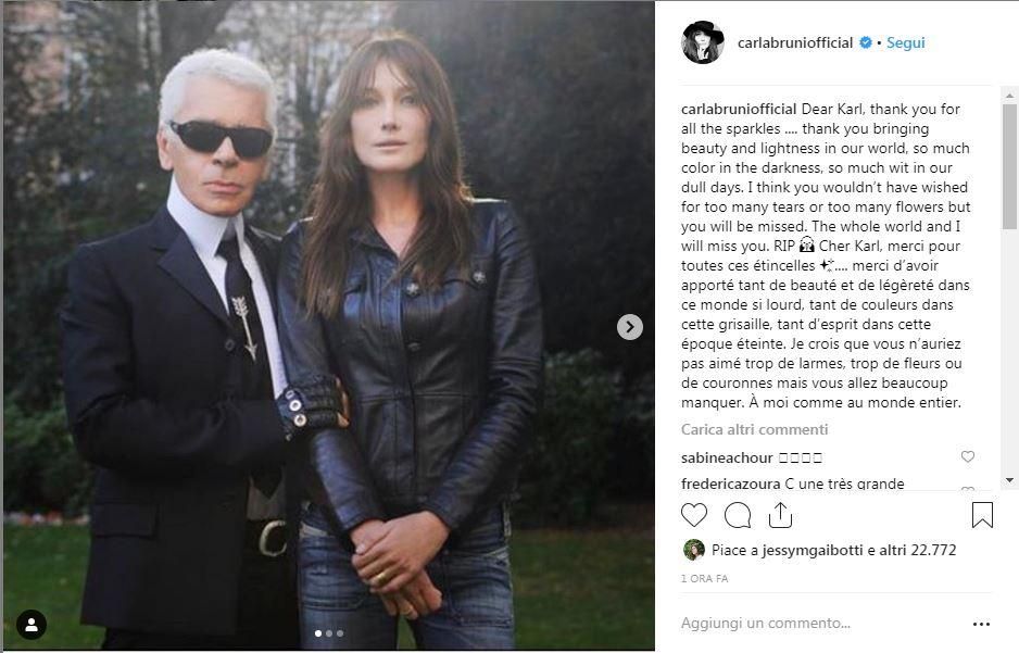 |Carla Bruni: "Caro Karl, grazie per tutte le scintille, per aver portato bellezza e leggerezza nel nostro mondo, cosiì tanto colore nel buio, cosiì tanto umorismo nei nostri giorni noiosi", scrive la moglie dell'ex presidente francese Nicolas Sarkozy, postando poi una foto che la ritrae insieme al direttore artistico di Chanel. "Penso che che non avresti voluto troppe lacrime o troppi fiori ma tu mancherai a me e al mondo intero. Riposa in pace"