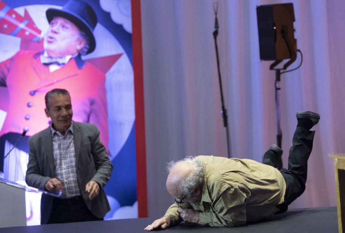 Danny DeVito cade sul palco durante la presentazione di "Dumbo"