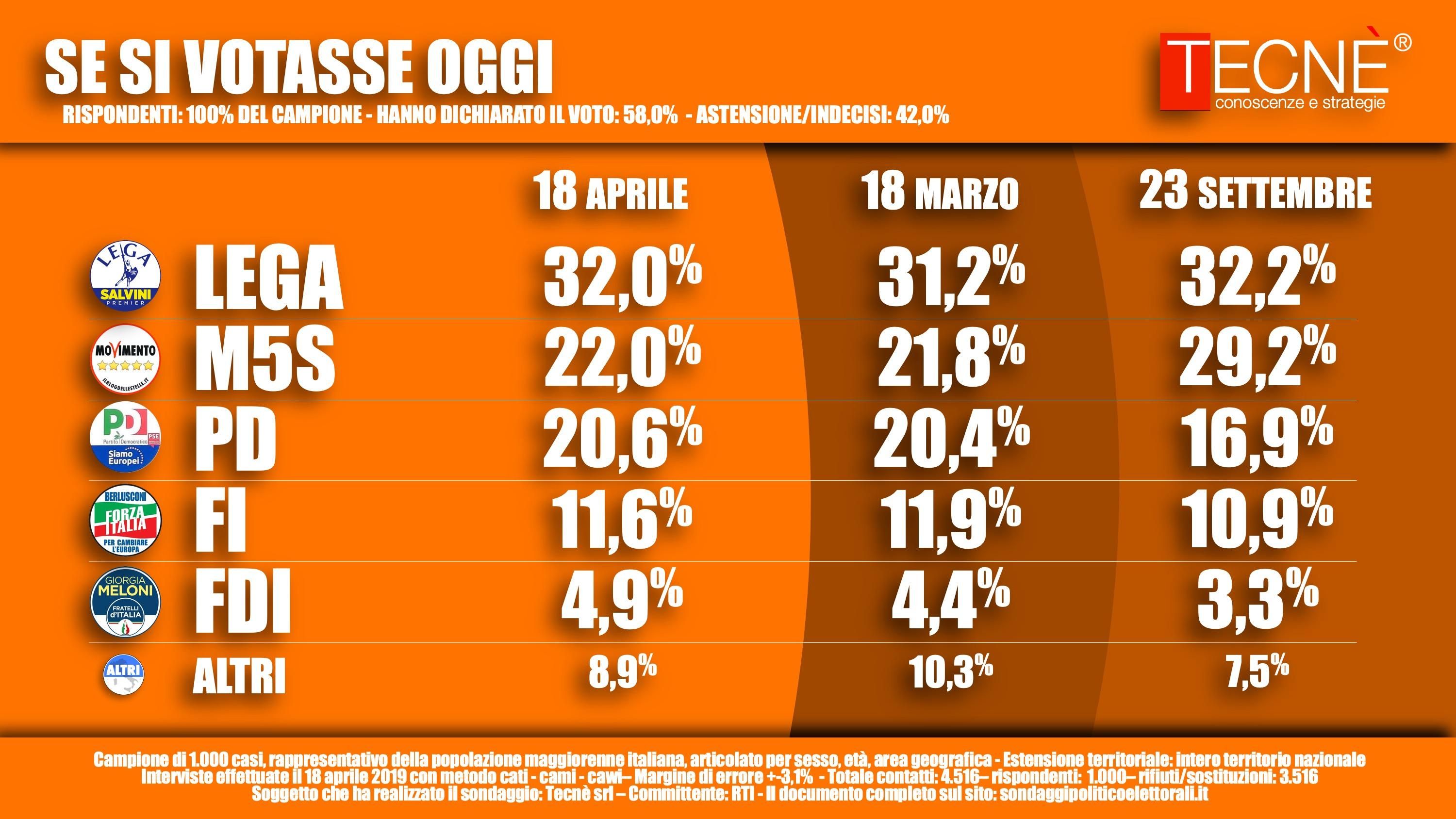 Sondaggio Tecné: Lega pigliatutto, in affanno il M5s