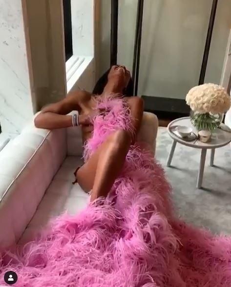 Naomi toglie l'abito da gala e resta nuda... con le piume