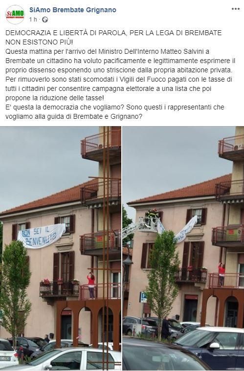 Brembate, i vigili del fuoco per rimuovere lo striscione anti-Salvini