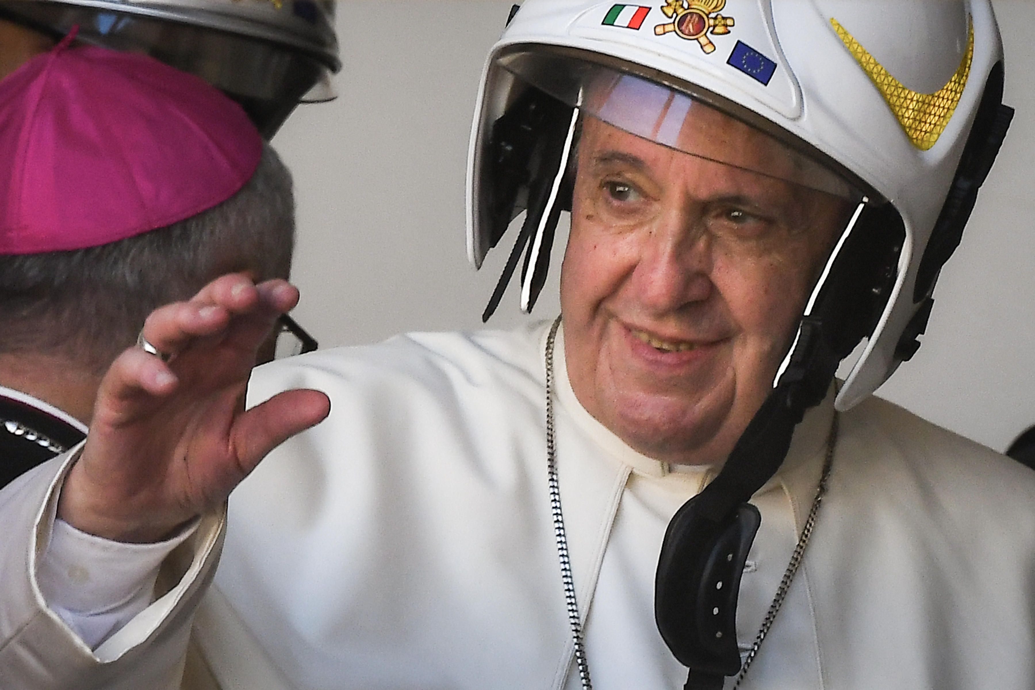Papa Francesco a Camerino dopo il sisma: elmetto d'ordinanza
